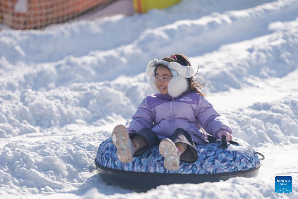 A child enjoys sliding on an inflatable snow sled outside the National Stadium, also known as the Bird's Nest, in Beijing, capital of China, Dec. 27, 2025. The winter theme park of the Bird's Nest kicked off on Saturday and will run till late February 2026. The event features an ice and snow activity zone, and an outdoor fashion and leisure zone. (Xinhua/Xie Han)