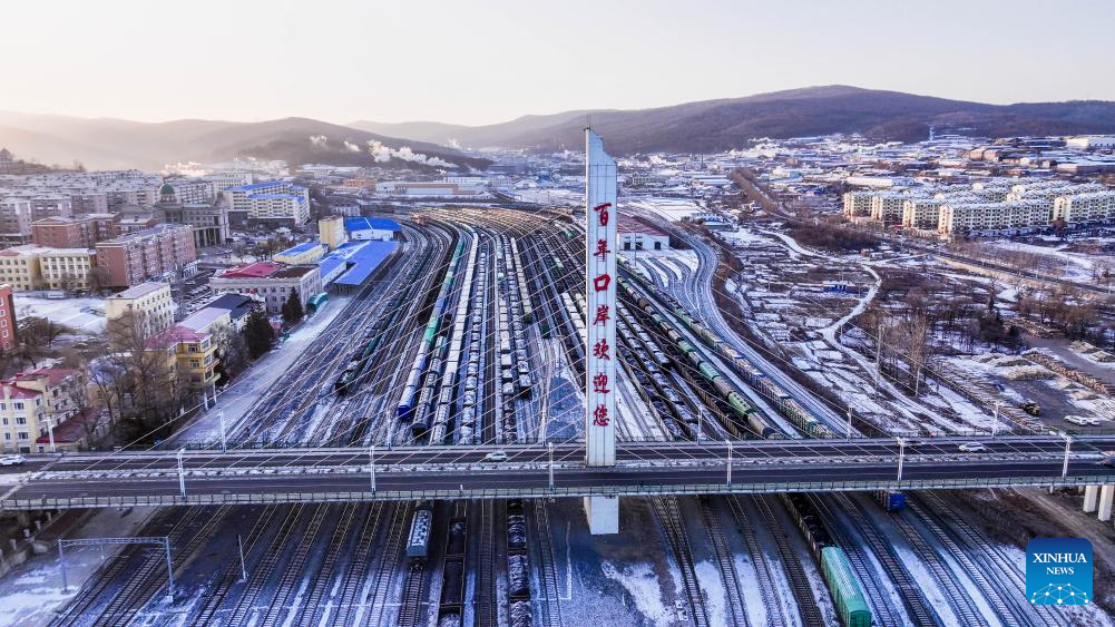 An aerial drone photo taken on Dec. 26, 2025 shows the China-Europe freight trains at the south yard of Suifenhe Railway Station in Suifenhe, northeast China's Heilongjiang Province. As a vital part of the eastern corridor of the China-Europe freight train network, the Suifenhe Railway Port has handled more than 4,000 China-Europe freight train trips since its launch in 2018, carrying over 390,000 TEUs of cargo, according to data from China Railway Harbin Group Co., Ltd. (Photo by Qu Yiwei/Xinhua)