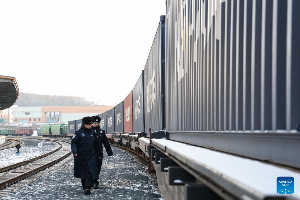 Police officers inspect a China-Europe freight train at the south yard of Suifenhe Railway Station in Suifenhe, northeast China's Heilongjiang Province, on Dec. 25, 2025. As a vital part of the eastern corridor of the China-Europe freight train network, the Suifenhe Railway Port has handled more than 4,000 China-Europe freight train trips since its launch in 2018, carrying over 390,000 TEUs of cargo, according to data from China Railway Harbin Group Co., Ltd. (Photo by Qu Yiwei/Xinhua)