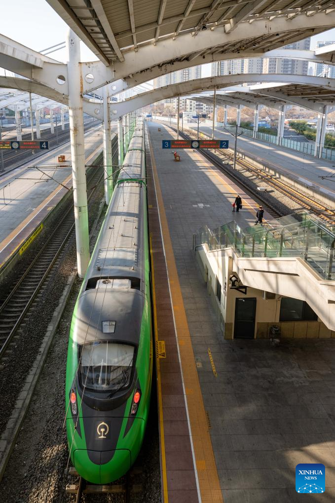 Train C125 stops at Baoding Railway Station along the Tianjin-Baoding Railway in Baoding, north China's Hebei Province, Dec. 27, 2025. The Tianjin-Baoding Railway, which began its operation on Dec. 28, 2015, is about to celebrate the 10th anniversary of its opening.