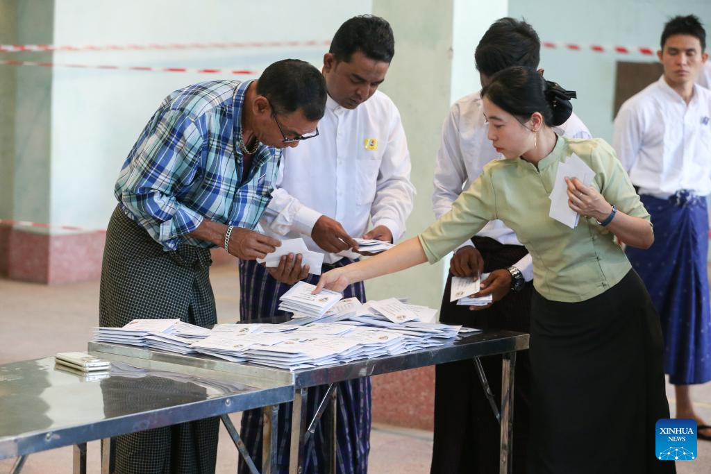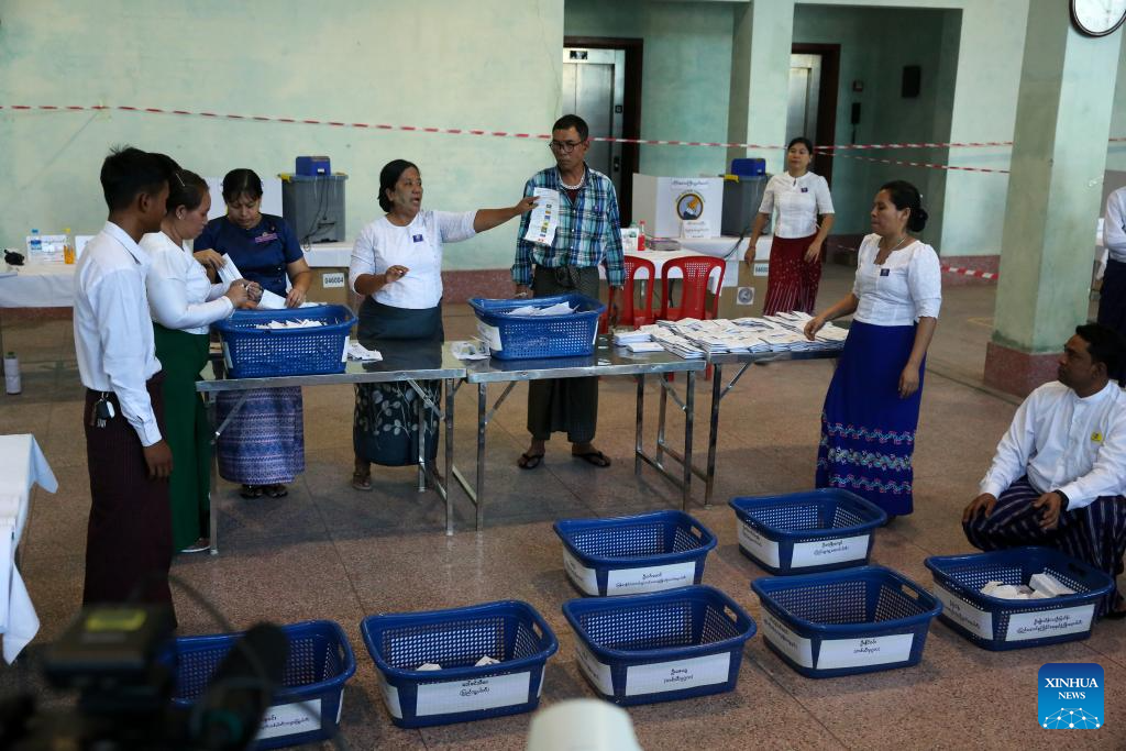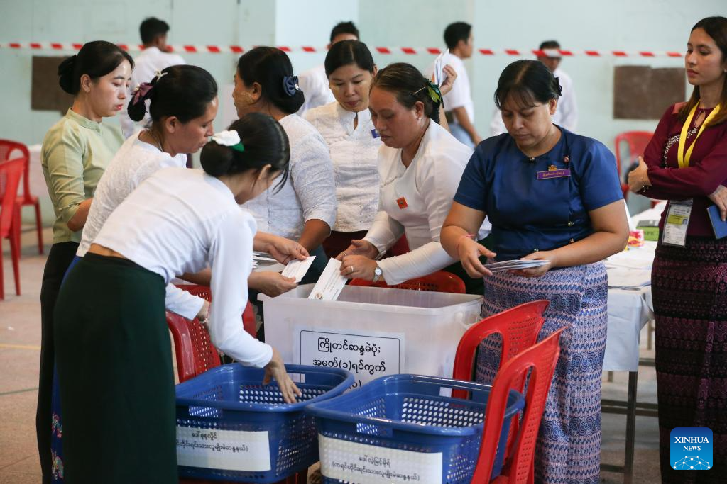 Officials of the Union Election Commission count votes during the general election at a polling station in Yangon, Myanmar, Dec. 28, 2025. Myanmar kicked off its 2025 multi-party democratic general election with the first phase held on Sunday. The general election is scheduled to be held in three phases, with the second phase set for Jan. 11, 2026, followed by the third phase on Jan. 25. (Xinhua/Myo Kyaw Soe)