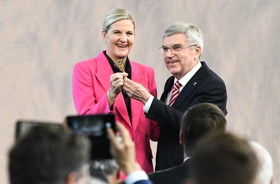 IOC president Kirsty Coventry (L) receives the key from outgoing president Thomas Bach during a handover ceremony at Olympic House in Lausanne, Switzerland, June 23, 2025. (Xinhua/Lian Yi)