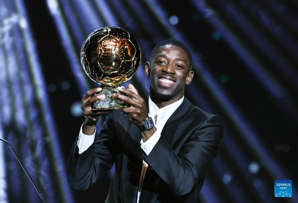 This file photo taken on Sept. 22, 2025 shows Paris Saint-Germain's French player Ousmane Dembele posing with his trophy during the 2025 Ballon d'Or France Football award ceremony at the Theatre du Chatelet in Paris, France. (Xinhua/Gao Jing)
