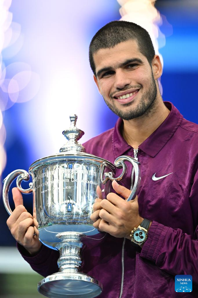 This file photo taken on Sept. 7, 2025 shows Carlos Alcaraz of Spain posing with his trophy after winning the men's singles final match between Carlos Alcaraz of Spain and Jannik Sinner of Italy at the 2025 US Open tennis championships in New York, the United States. (Xinhua/Li Rui)