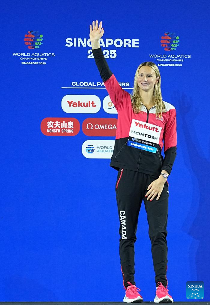 This file photo taken on July 31, 2025 shows Summer McIntosh of Canada waving to the spectators during the awarding ceremony for the women's 200m butterfly final of swimming at the World Aquatics Championships in Singapore. (Xinhua/Xue Yuge)
