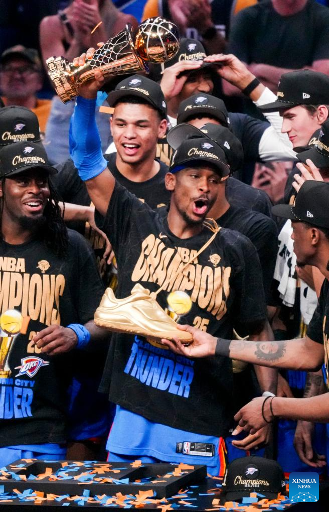 This file photo taken on June 22, 2025 shows Shai Gilgeous-Alexander (front C) of Oklahoma City Thunder celebrating after winning the FMVP title after the game seven of the 2024-2025 season NBA Finals between Oklahoma City Thunder and Indiana Pacers in Oklahoma City, the United States. (Photo by Sun Yuxuan/Xinhua)