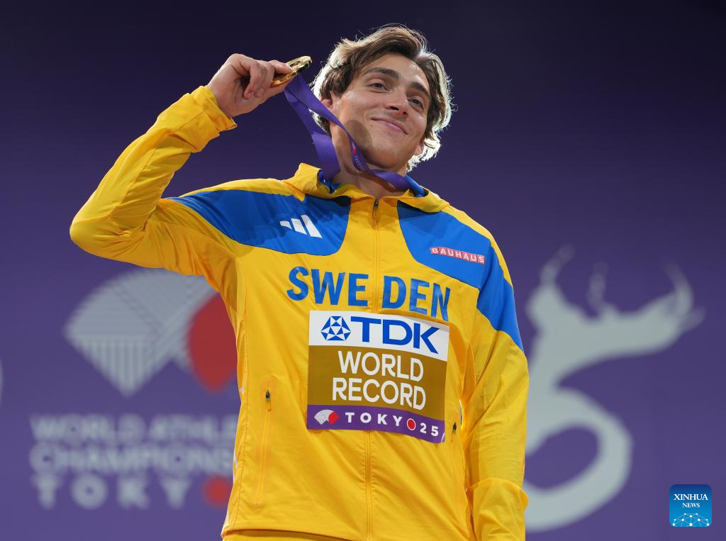 This file photo taken on Sept. 16, 2025 shows gold medalist Armand Duplantis of Sweden posing during the men's pole vault awarding ceremony at the 2025 World Athletics Championships in Tokyo, Japan. (Xinhua/Jiang Han)