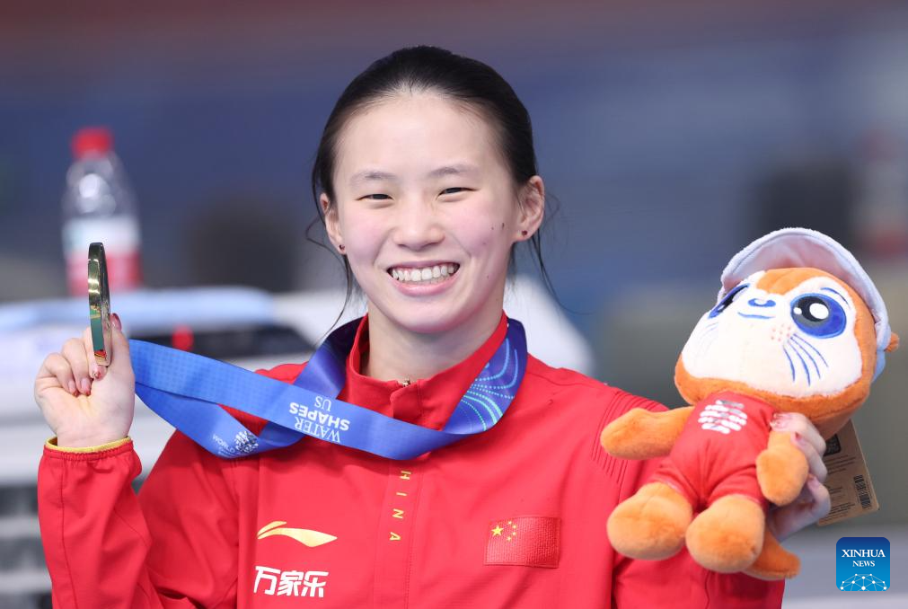 This file photo taken on July 31, 2025 shows Chen Yuxi of China posing after the awarding ceremony for the women's 10m platform final of diving at the World Aquatics Championships in Singapore. (Xinhua/Luo Yuan)