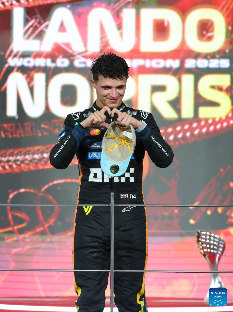 This file photo taken on Dec. 7, 2025 shows McLaren's British driver Lando Norris celebrating after the Formula One Abu Dhabi Grand Prix at the Yas Marina Circuit in Abu Dhabi, the United Arab Emirates. (Photo by Zhu Xingjian/Xinhua)
