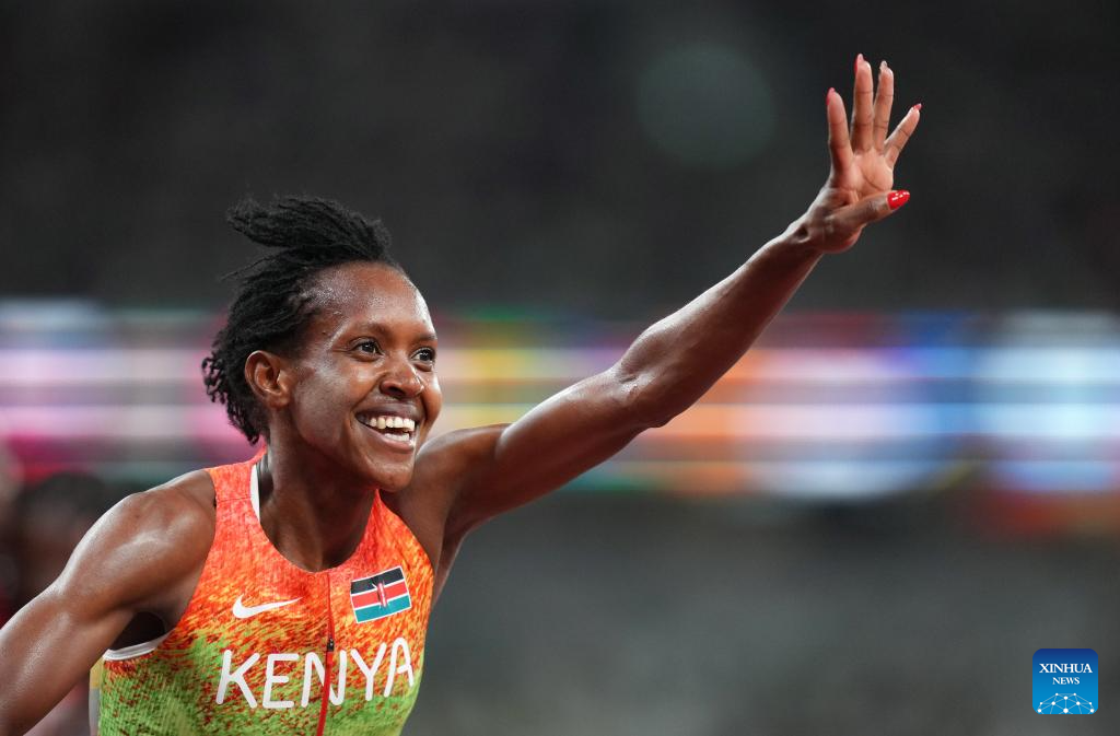 This file photo taken on Sept. 16, 2025 shows gold medalist Faith Kipyegon of Kenya celebrating after the women's 1500m final at the 2025 World Athletics Championships in Tokyo, Japan. (Xinhua/Ju Huanzong)