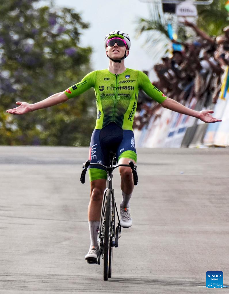 This file photo taken on Sept. 28, 2025 shows Tadej Pogacar of Slovenia celebrating after crossing the finish line during the men's elite road race at the 2025 UCI Road World Championships in Kigali, Rwanda. (Xinhua/Li Yahui)