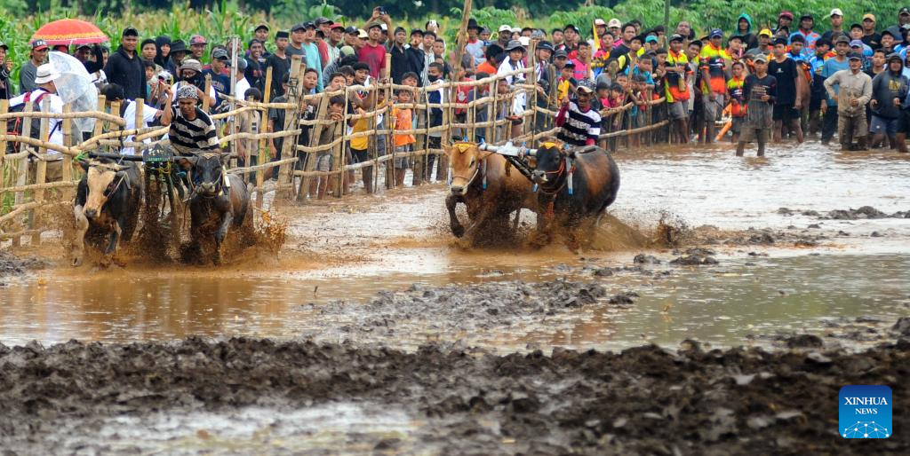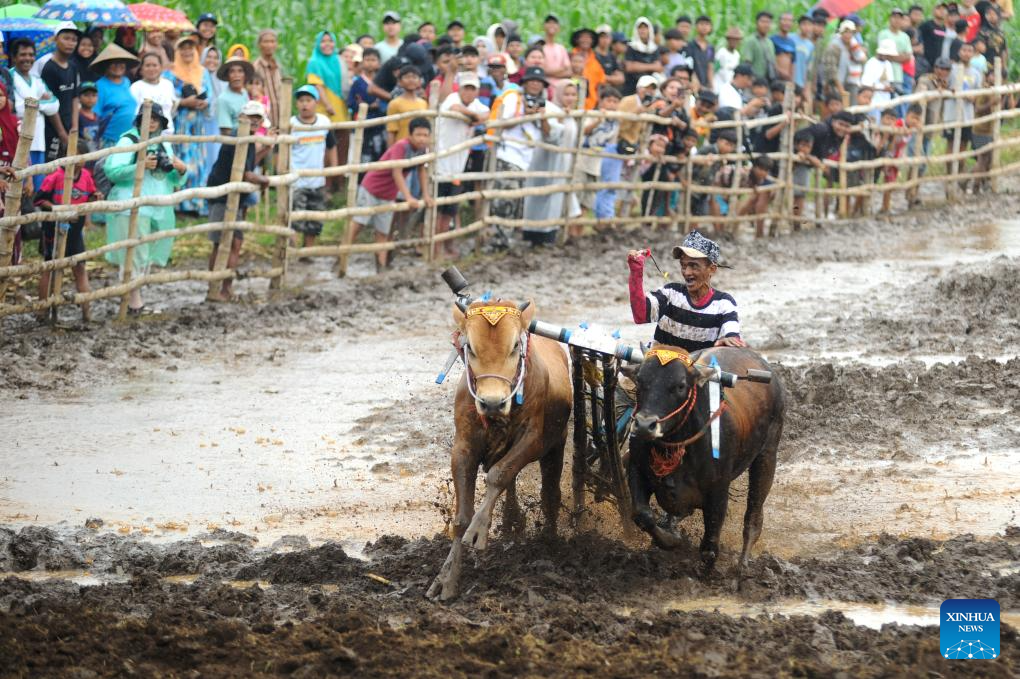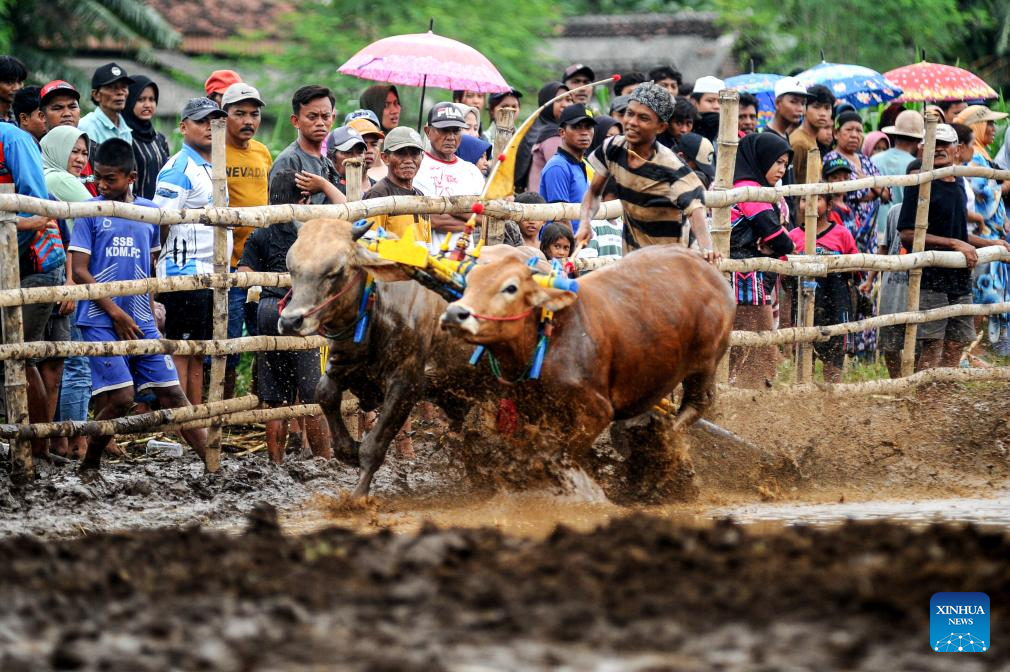People and their bulls participate in Karapan Sapi Brujul, a traditional bull racing event, in Probolinggo, Indonesia, on Dec. 27, 2025. (Photo by Sahlan Kurniawan/Xinhua)