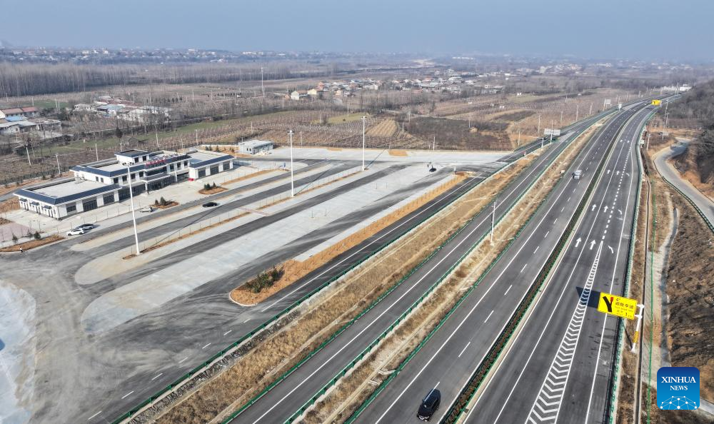This aerial drone photo taken on Dec. 29, 2025 shows a service area at a section of the expressway linking Meixian County and Taibai County in northwest China's Shaanxi Province. The 75-km-long expressway linking Meixian County and Taibai County in Shaanxi started operation on Monday. (Xinhua/Zhang Bowen)
