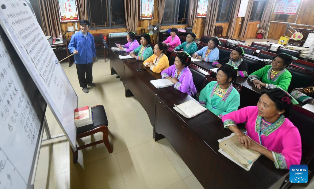 Villagers attend a night class at Wuying Miao village in Rongshui Miao Autonomous County, south China's Guangxi Zhuang Autonomous Region, Sept. 26, 2025.