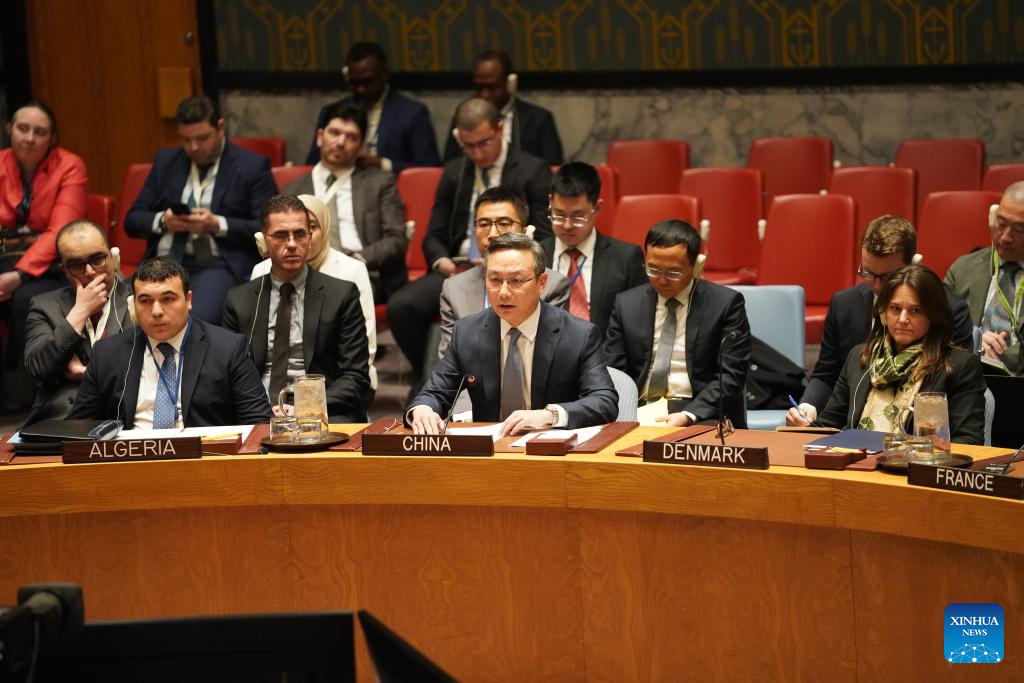 Sun Lei (C, front), China's deputy permanent representative to the United Nations, speaks at a UN Security Council meeting at the UN headquarters in New York, on Dec. 29, 2025. The Chinese envoy on Monday stressed that the Golan Heights are internationally recognized as occupied Syrian territory. The UN Security Council on Monday unanimously adopted a resolution to extend the mandate of the UN peacekeeping force in the Golan Heights for six months, until June 30, 2026. (Xinhua/Zhang Fengguo)