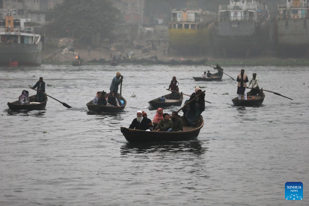 Boats ferry passengers across the Buriganga River amid winter fog in Dhaka, Bangladesh, Dec. 29, 2025. (Photo by Habibur Rahman/Xinhua)