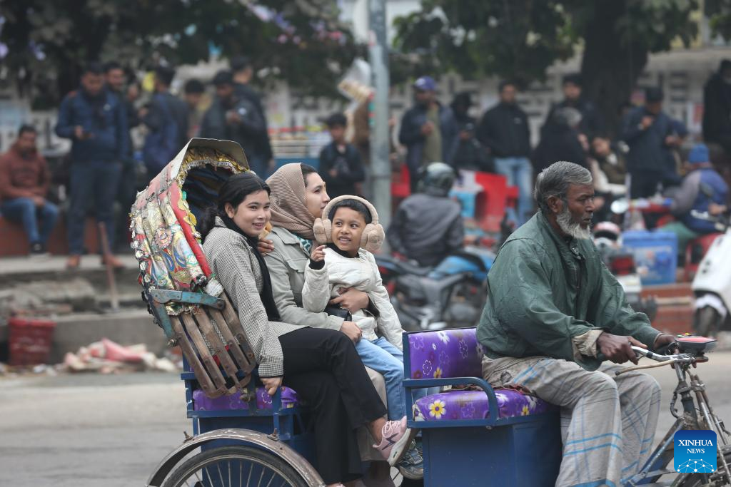 Girls wearing winter clothes ride on a rickshaw on a cold winter day in Dhaka, Bangladesh, Dec. 29, 2025. (Photo by Habibur Rahman/Xinhua)
