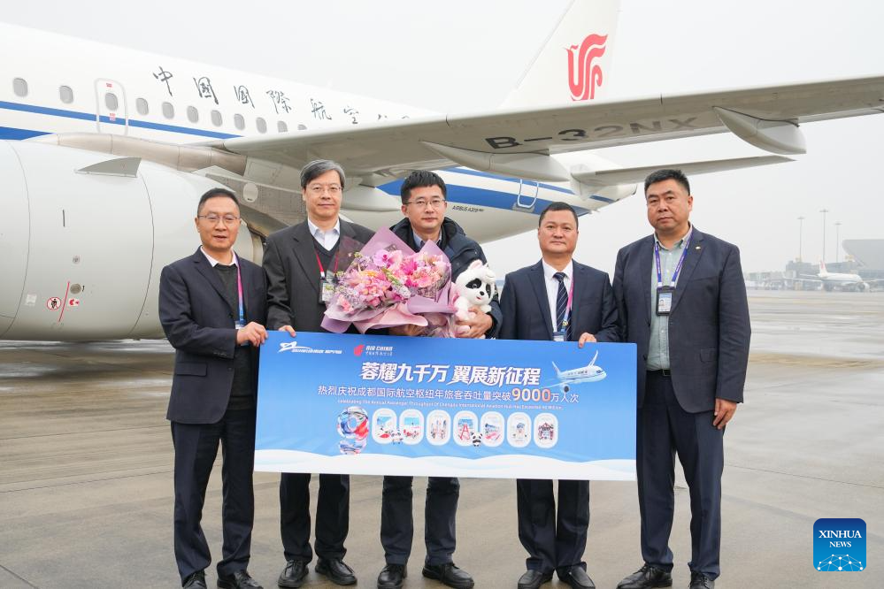 Upon the smooth landing of Air China flight CA4182 from Beijing to Chengdu at Chengdu Shuangliu International Airport on Wednesday, the annual passenger throughput of the Chengdu International Aviation Hub surpassed 90 million for the first time. (Xinhua/Wang Xi)