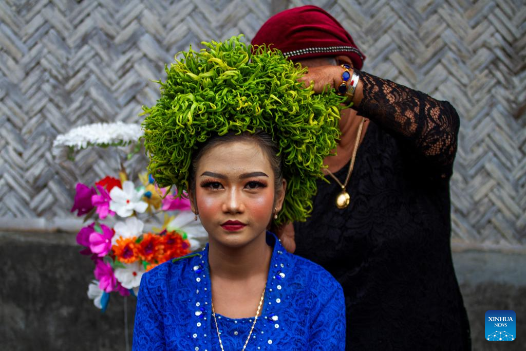A girl decorated with flowers on her head for the traditional Ngarot Festival is pictured in Indramayu, West Java, Indonesia on Dec. 31, 2025. Ngarot is a traditional ceremony in Indramayu of West Java Province held to welcome the rice planting season. (Photo by Septianjar Muharam/Xinhua)