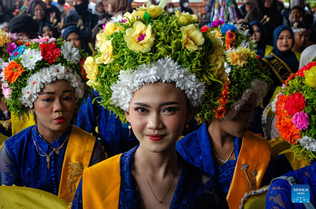 Girls decorated with flowers on their heads participate in a celebration for the traditional Ngarot Festival in Indramayu, West Java, Indonesia on Dec. 31, 2025. Ngarot is a traditional ceremony in Indramayu of West Java Province held to welcome the rice planting season. (Photo by Septianjar Muharam/Xinhua)