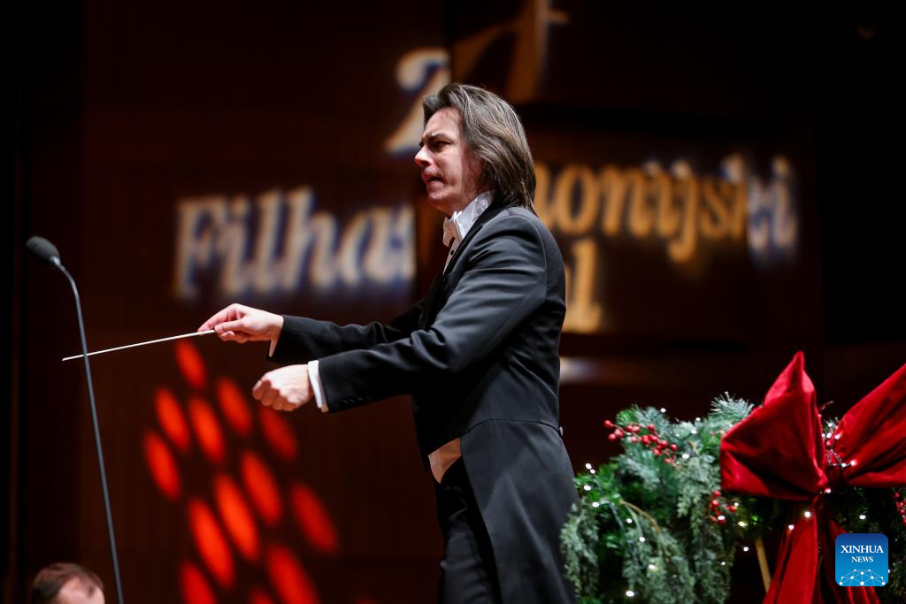 Conductor of the Zagreb Philharmonic Orchestra Dawid Runtz is pictured during the Philharmonic Ball 2025 at Vatroslav Lisinski Concert Hall in Zagreb, Croatia, on Dec. 30, 2025. (Matija Habljak/PIXSELL via Xinhua)