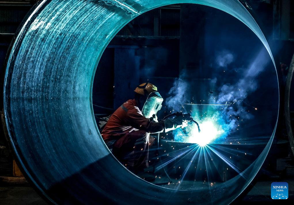 A technician welds components at a rail transit equipment company in Wuhan, central China's Hubei Province, Dec. 31, 2025. (Photo by Zhao Jun/Xinhua)