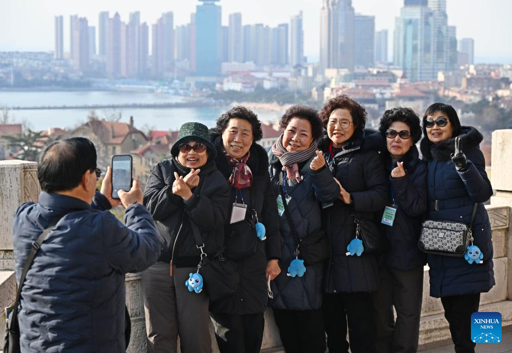 South Korean tourists pose for photos at Xiaoyushan scenic spot in Qingdao City, east China's Shandong Province, Dec. 31, 2025.