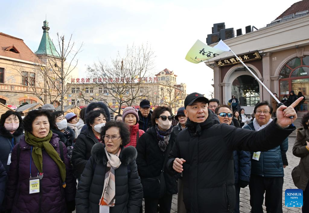 A group of over 100 South Korean tourists arrived in Qingdao on Wednesday for the New Year tour, with travel itineraries including health care, sightseeing in scenic spots and business districts, and cultural activities. (Xinhua/Li Ziheng)