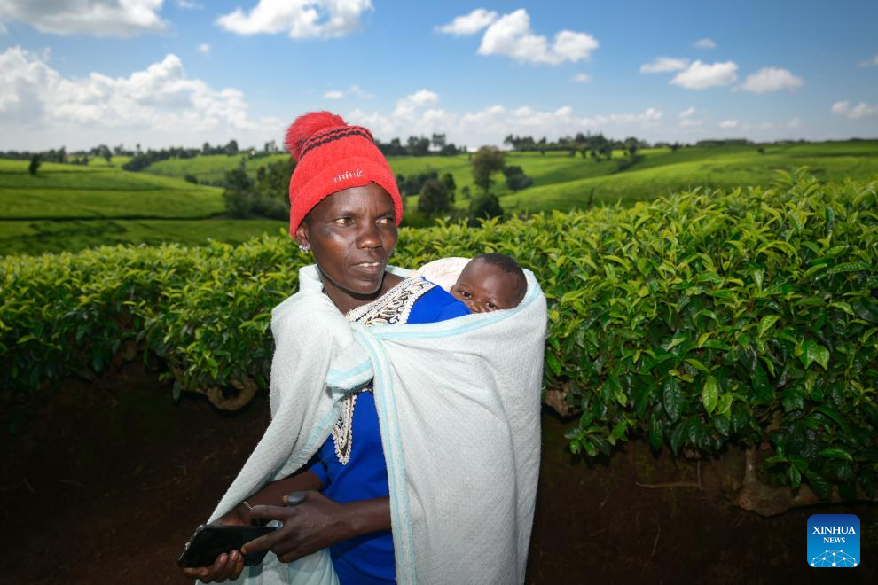 A tea farmer carries a baby on her back at a tea garden in Kiambu, Kenya, Jan. 1, 2026. (Xinhua/Yang Guang)