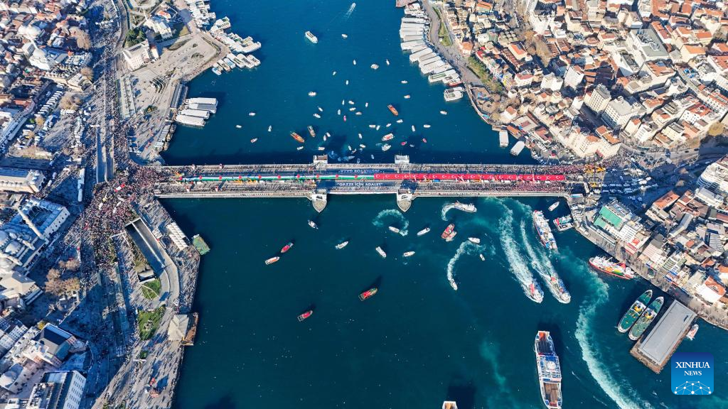 An aerial drone photo taken on Jan. 1, 2026 shows people gathering on the Galata Bridge to show solidarity with Palestine in Istanbul, Türkiye. More than half a million people rallied in Türkiye's largest city Istanbul on New Year's Day to show solidarity with Gaza. (Xinhua/Liu Lei)