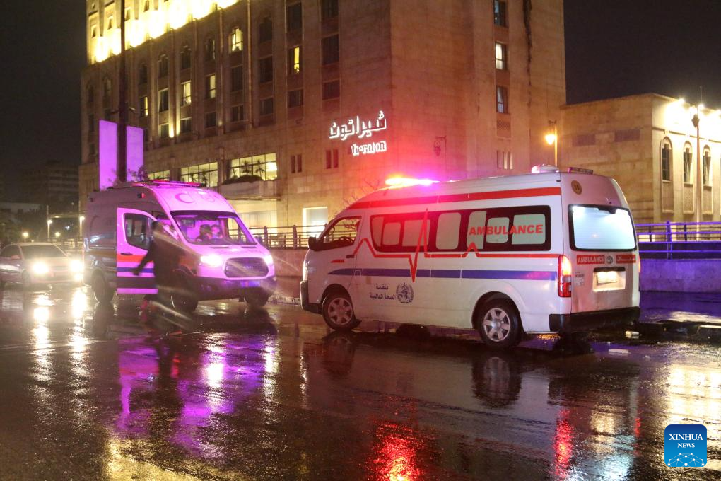 Photo taken on early hours of Jan. 1, 2026 shows ambulances near the site of the suicide bombing in Aleppo city, northern Syria. One person was killed, and several members of Syria's internal security forces were wounded on Wednesday after a suicide bomber targeted a police patrol in the Bab al-Faraj area of northern Syria's Aleppo city, according to several state media reports. (Str/Xinhua)