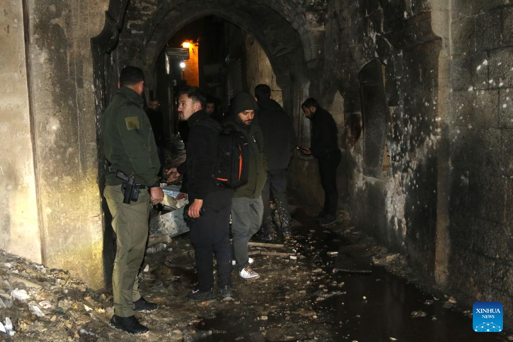 Photo taken on early hours of Jan. 1, 2026 shows people checking the site of the suicide bombing in Aleppo city, northern Syria. (Str/Xinhua)