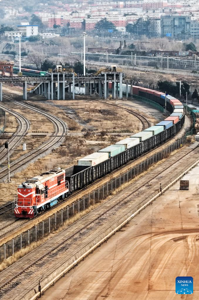 A drone photo taken on Jan. 1, 2026 shows a freight train loaded with auto parts pulling out of the China-Kazakhstan (Lianyungang) Logistics Cooperation Base for Kazakhstan in Lianyungang, east China's Jiangsu Province. It marks the first China-Europe freight train launched by the base in 2026. (Photo by Wang Jianmin/Xinhua)