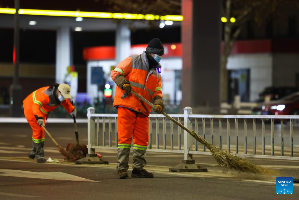 Sanitation workers clean a street in Xinhua District of Shijiazhuang City, north China's Hebei Province, on Jan. 1, 2026.