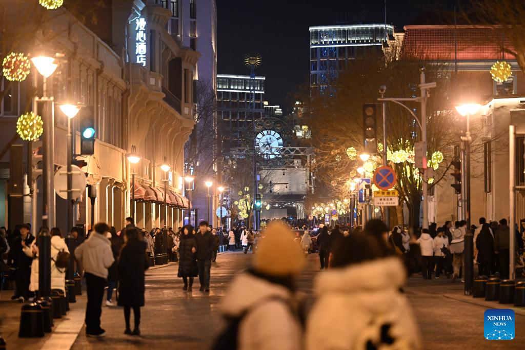 Tourists visit the Jiefang North Road historical and cultural block in Tianjin, north China, Jan. 1, 2026. Located on the south bank of the Haihe River in Tianjin, the century-old Jiefang North Road historical and cultural block used to be a neighborhood where many banks clustered. Now, the streets there decorated with festive lights have attracted many tourists for a citywalk during the New Year's Day holiday. (Xinhua/Zhao Zishuo)