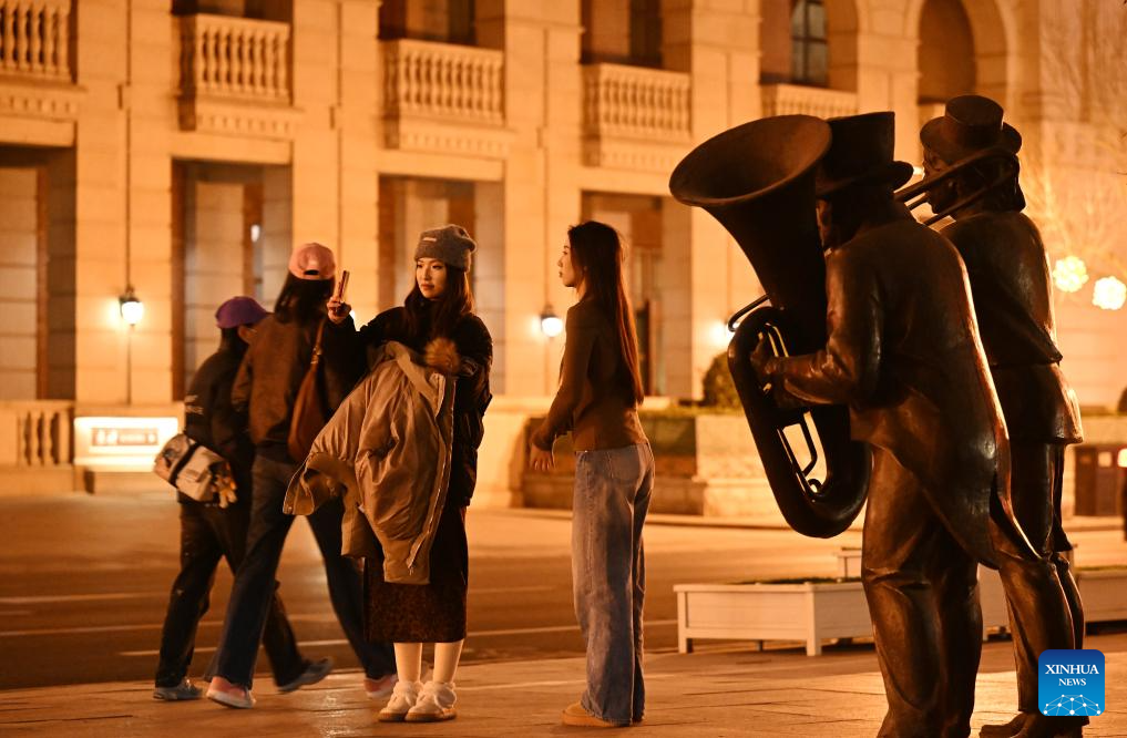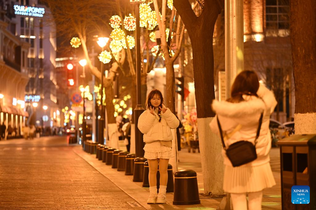 A tourist poses for photos at the Jiefang North Road historical and cultural block in Tianjin, north China, Jan. 1, 2026. Located on the south bank of the Haihe River in Tianjin, the century-old Jiefang North Road historical and cultural block used to be a neighborhood where many banks clustered. Now, the streets there decorated with festive lights have attracted many tourists for a citywalk during the New Year's Day holiday. (Xinhua/Li Ran)