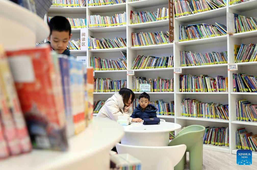 A mother reads a book to her son at a library in the Jiefang North Road historical and cultural block in Tianjin, north China, Jan. 2, 2026. Located on the south bank of the Haihe River in Tianjin, the century-old Jiefang North Road historical and cultural block used to be a neighborhood where many banks clustered. Now, the streets there decorated with festive lights have attracted many tourists for a citywalk during the New Year's Day holiday. (Xinhua/Li Ran)