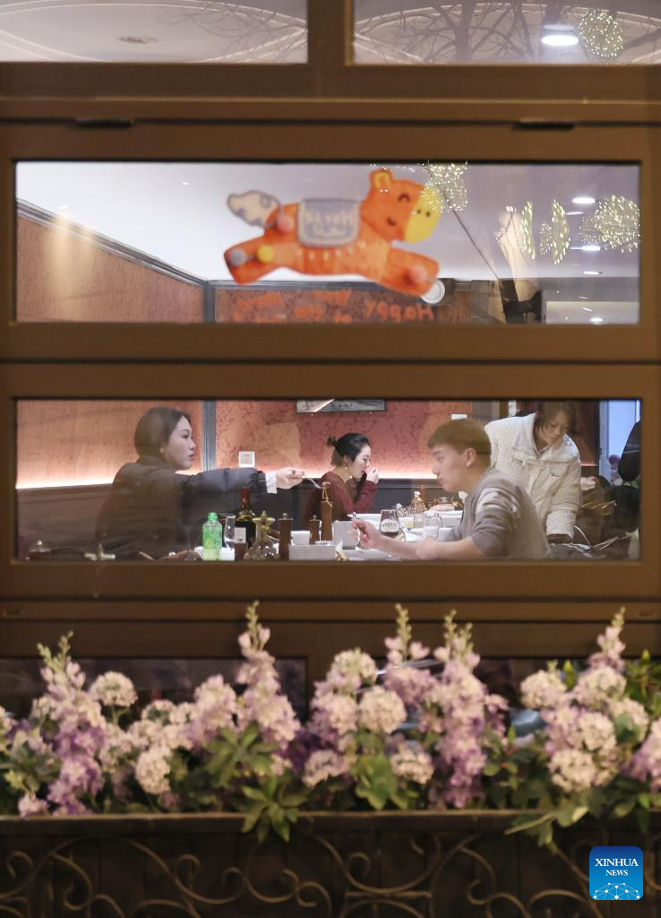 People enjoy meals at a restaurant in the Jiefang North Road historical and cultural block in Tianjin, north China, Jan. 1, 2026. Located on the south bank of the Haihe River in Tianjin, the century-old Jiefang North Road historical and cultural block used to be a neighborhood where many banks clustered. Now, the streets there decorated with festive lights have attracted many tourists for a citywalk during the New Year's Day holiday. (Xinhua/Li Ran)