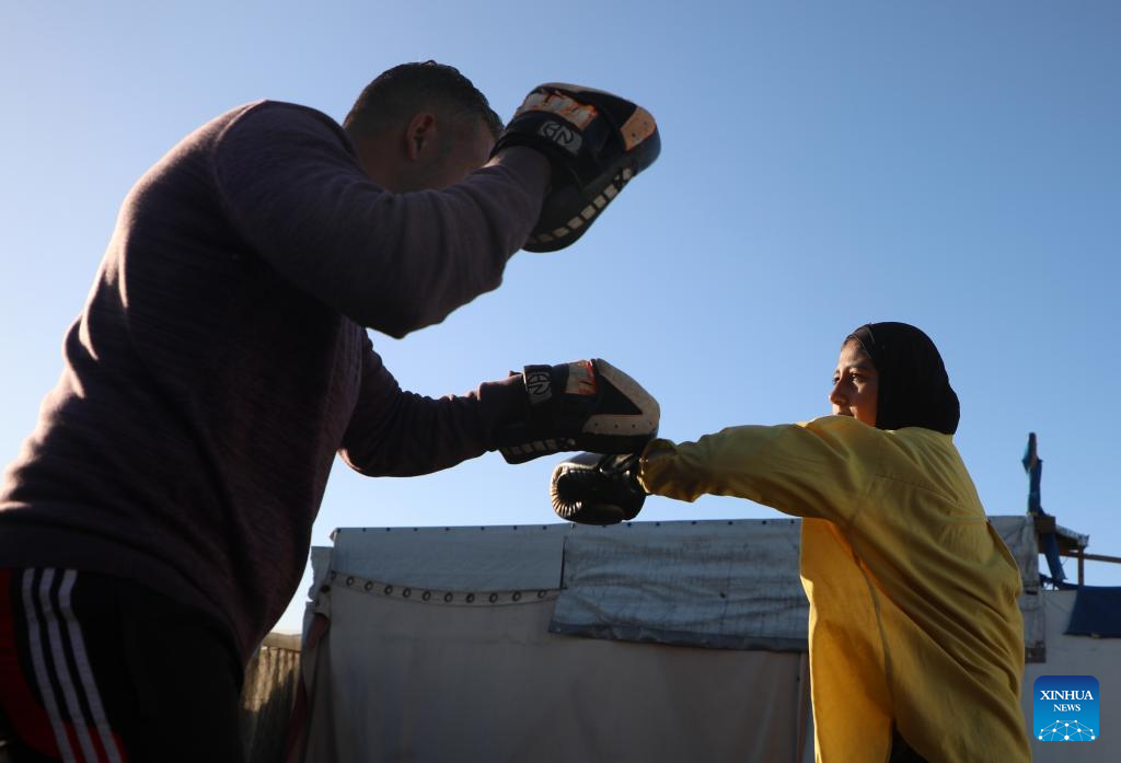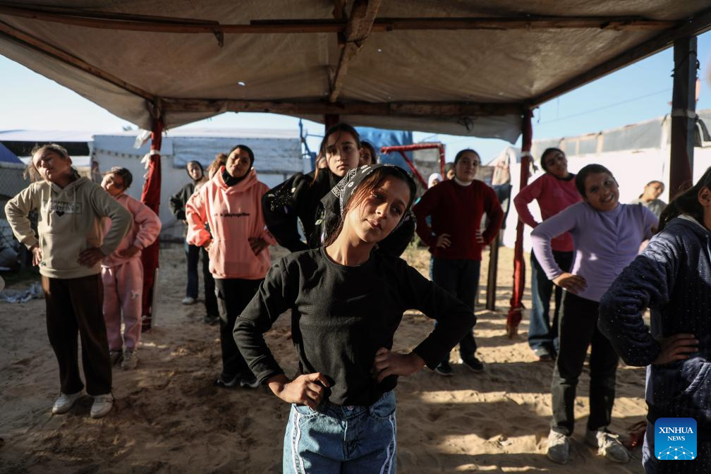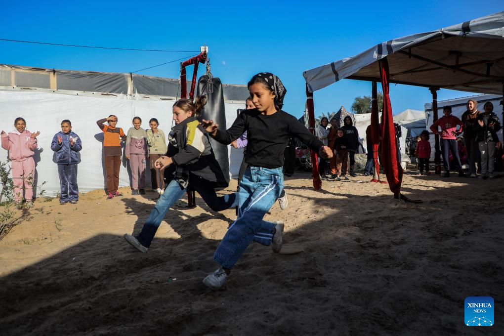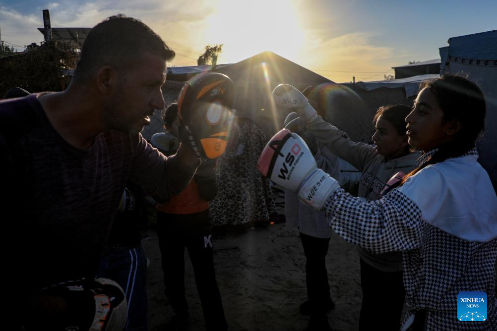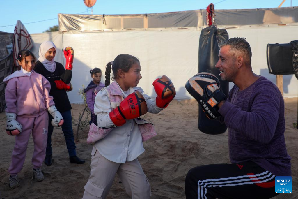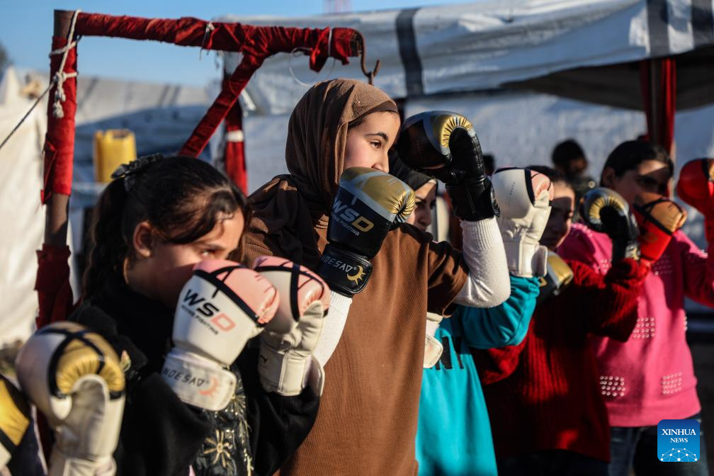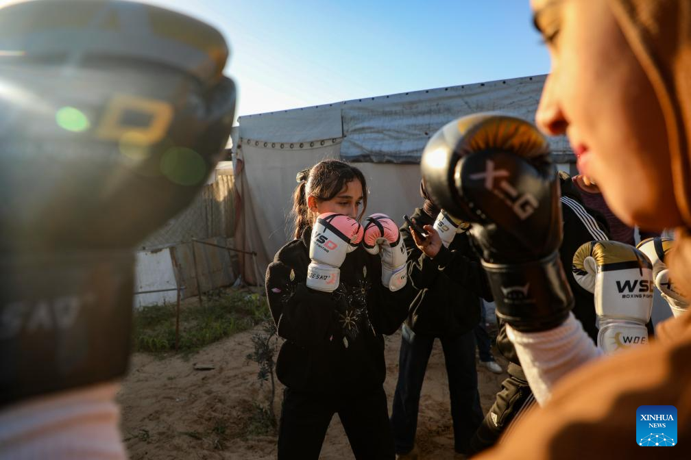Palestinian girls take part in a boxing training session aimed for psychological relief and physical empowerment at a displacement camp in the Al-Mawasi area of Khan Younis, southern Gaza Strip, on Dec. 31, 2025. (Photo by Rizek Abdeljawad/Xinhua)