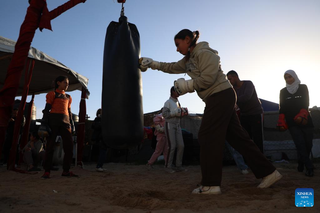 A Palestinian girl takes part in a boxing training session aimed for psychological relief and physical empowerment at a displacement camp in the Al-Mawasi area of Khan Younis, southern Gaza Strip, on Dec. 31, 2025. (Photo by Rizek Abdeljawad/Xinhua)