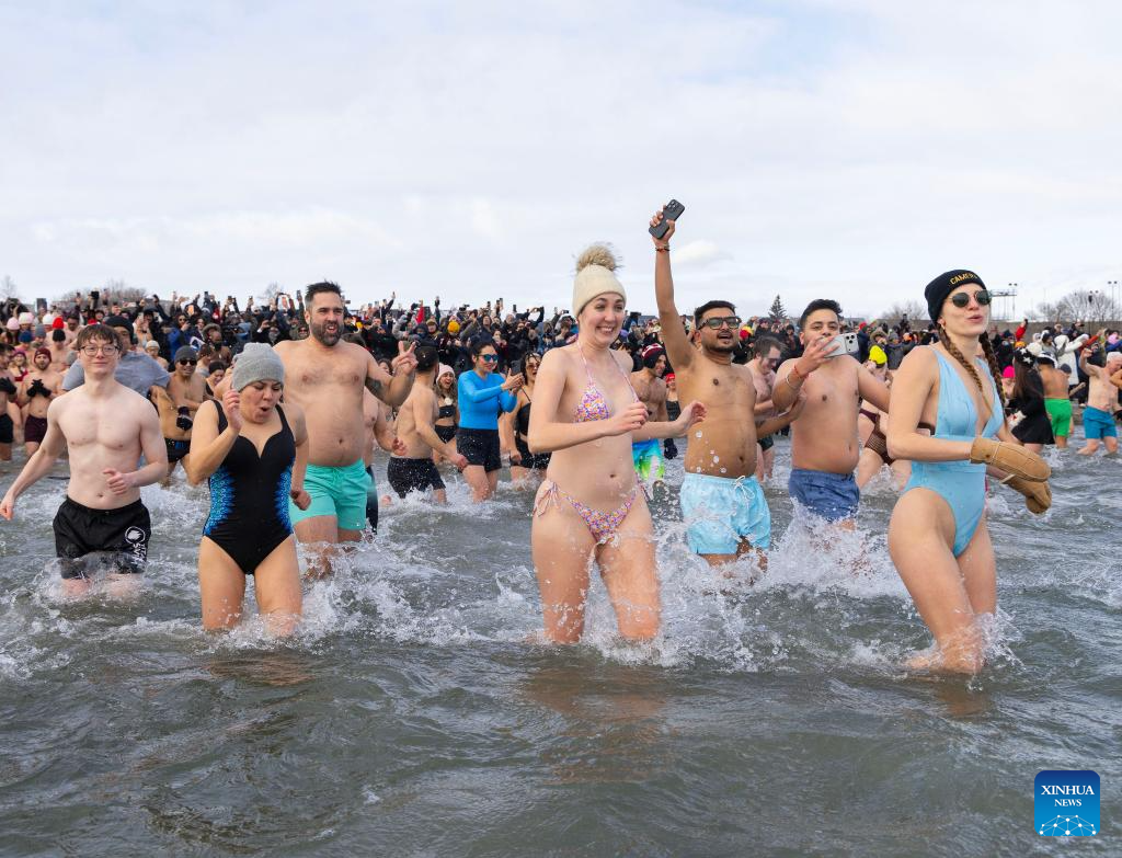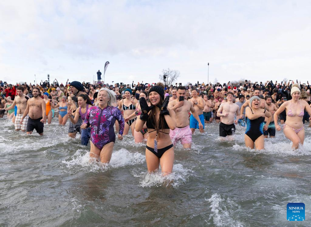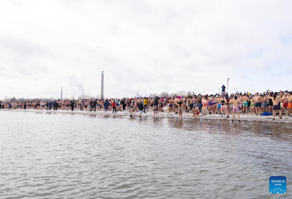 (260102) -- TORONTO, Jan. 2, 2026 (Xinhua) -- Participants take part in the Toronto Polar Bear Dip event in Toronto, Canada, on Jan. 1, 2026. Hundreds of people braved the chilly waters here on Thursday to celebrate the first day of 2026 and raise funds for charity. (Photo by Zou Zheng/Xinhua)