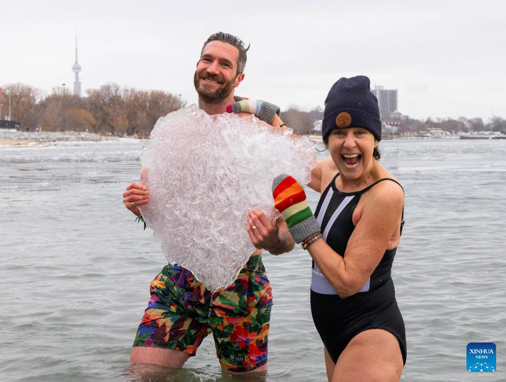 (260102) -- TORONTO, Jan. 2, 2026 (Xinhua) -- Participants pose for photos with a piece of floating ice in Lake Ontario during the Toronto Polar Bear Dip event in Toronto, Canada, on Jan. 1, 2026. Hundreds of people braved the chilly waters here on Thursday to celebrate the first day of 2026 and raise funds for charity. (Photo by Zou Zheng/Xinhua)