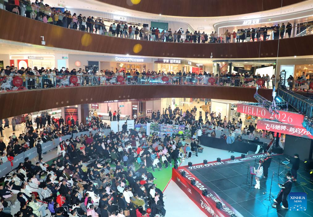 People watch a performance at a shopping mall in Nanyang, central China's Henan Province, Jan. 1, 2026. China's economy kicked off 2026 with robust momentum, as evidenced by bustling economic activity in the year's first days. (Photo by Gao Song/Xinhua)
