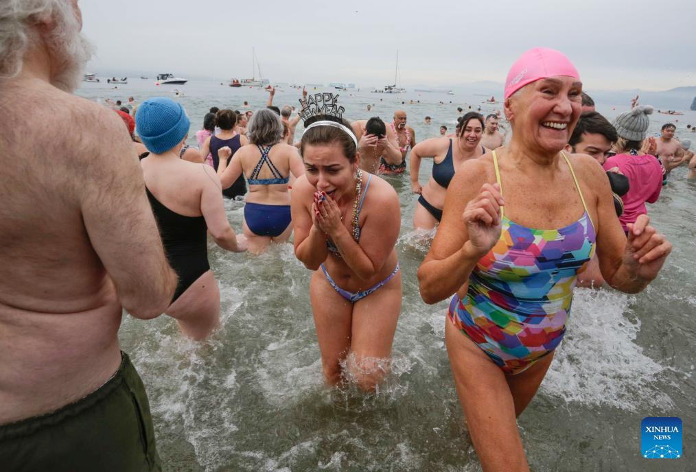 People take part in the 106th Polar Bear Swim on New Year's Day in Vancouver, British Columbia, Canada, Jan. 1, 2026. (Photo by Liang Sen/Xinhua)