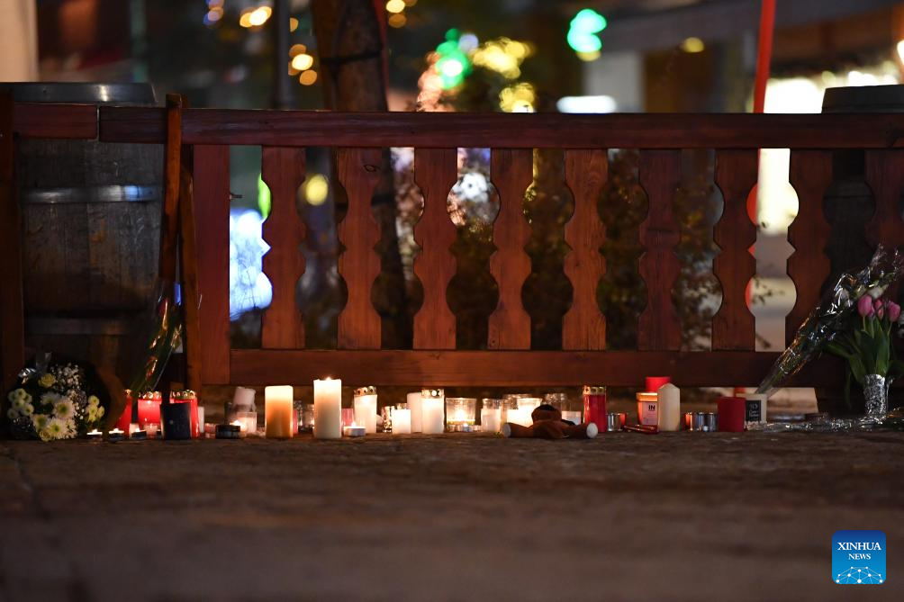 Candles and flowers to mourn the victims of a fire at a bar in the Crans-Montana ski resort are pictured in Valais Canton of southwestern Switzerland, Jan. 1, 2026. Around 40 people are believed to have died in a bar fire breaking out in southwestern Switzerland, with the number of injured rising to 119, police said at a news conference on Friday afternoon. (Xinhua/Lian Yi)