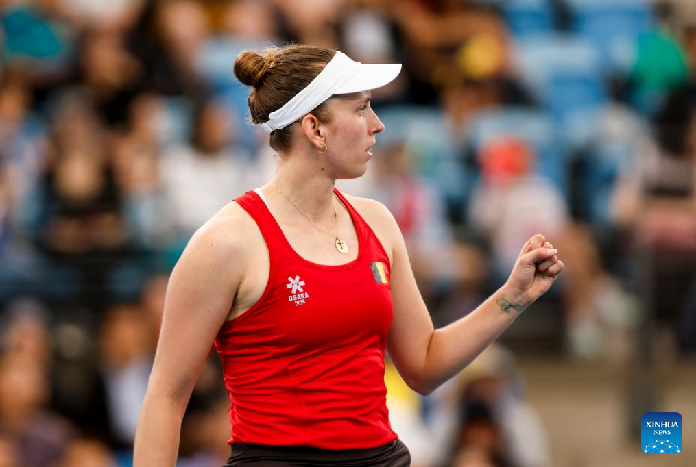 Elise Mertens of Belgium celebrates during the women's singles match against Zhu Lin of China in the Group B round robin match between China and Belgium at the 2026 United Cup tennis tournament in Sydney, Australia, Jan. 3, 2026. (Xinhua/Ma Ping)
