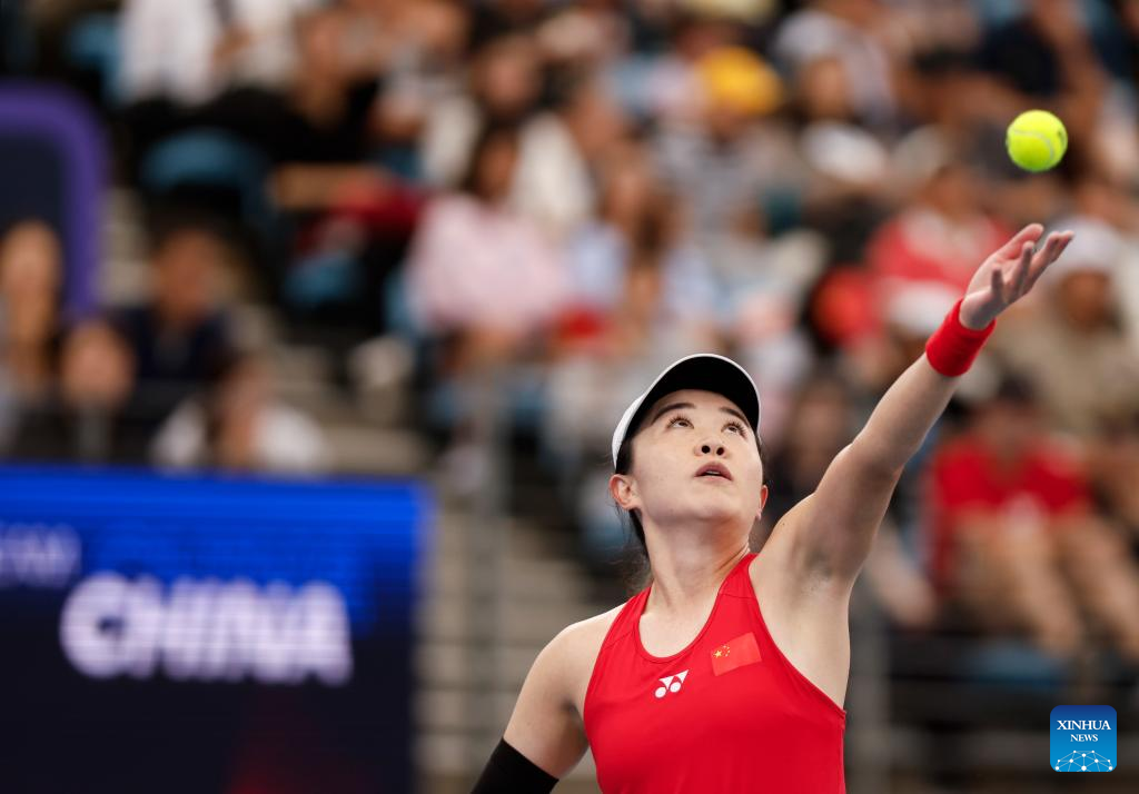 Zhu Lin of China serves to Elise Mertens of Belgium during the women's singles match in the Group B round robin match between China and Belgium at the 2026 United Cup tennis tournament in Sydney, Australia, Jan. 3, 2026. (Xinhua/Ma Ping)
