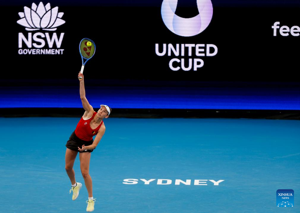 Elise Mertens of Belgium serves to Zhu Lin of China during the women's singles match in the Group B round robin match between China and Belgium at the 2026 United Cup tennis tournament in Sydney, Australia, Jan. 3, 2026. (Xinhua/Ma Ping)