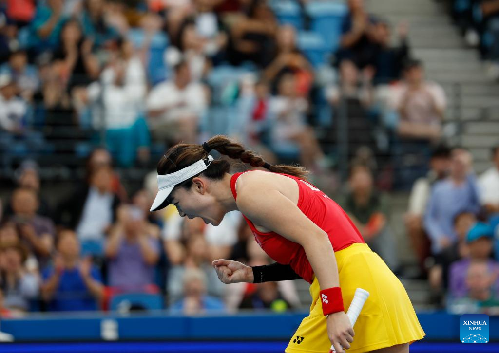 Zhu Lin of China celebrates during the women's singles match against Elise Mertens of Belgium in the Group B round robin match between China and Belgium at the 2026 United Cup tennis tournament in Sydney, Australia, Jan. 3, 2026. (Xinhua/Ma Ping)