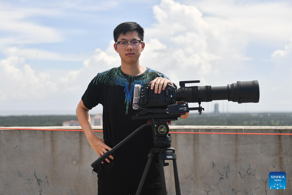Jin Yuchang, an aerospace enthusiast, shows the movie camera he purchased to film the rocket launch in Wenchang, south China's Hainan Province, Sept. 19, 2021. (Xinhua/Pu Xiaoxu)